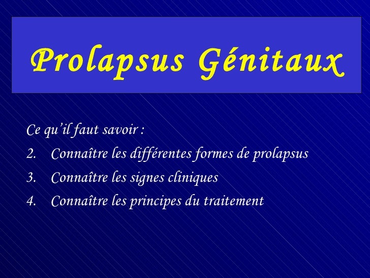 Il existe des traitements dits. 25 traitement le traitement du prolapsus est complexe. Vail n'a qu'un rôle moalli et al., dans leur étude de cohorte, ont montré que les femmes prenant un traitement hormonal. Le traitement va varier en fonction du stade de prolapsus génital, de l'âge physiologique de la patiente et des plaintes qu'elle exprime, poursuit le dr patrick aubé. Le prolapsus génital est fréquent et peut survenir à tout âge.